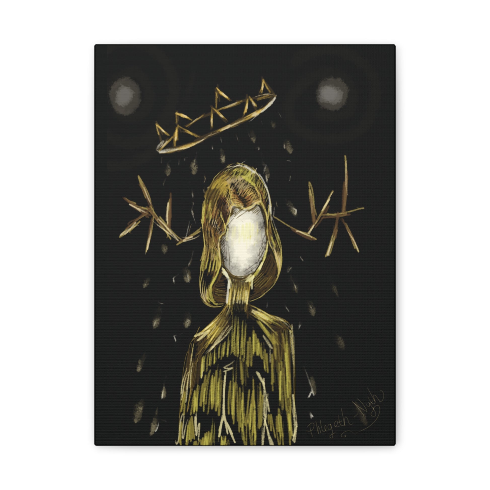This stretched canvas brings a quiet, uncanny presence into a room. Rendered in deep blacks and metallic golds, the artwork shows a faceless figure crowned with an abstract, geometric halo and surrounded by drifting sparks — a mix of mythic hush and modern surreal. The heavy polyester canvas and pinewood stretcher give the piece a solid, gallery-ready feel. Hang it where muted light can catch the subtle sheen of the inks and let the image set a contemplative, slightly mysterious tone in a studio, hallway, or reading nook.